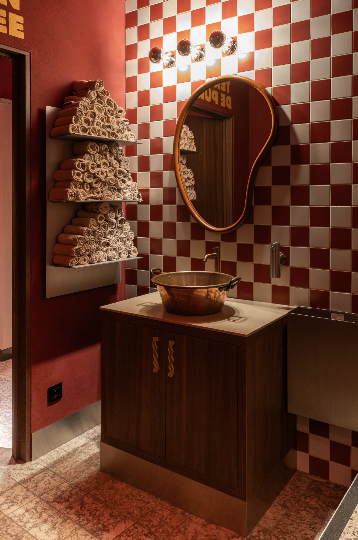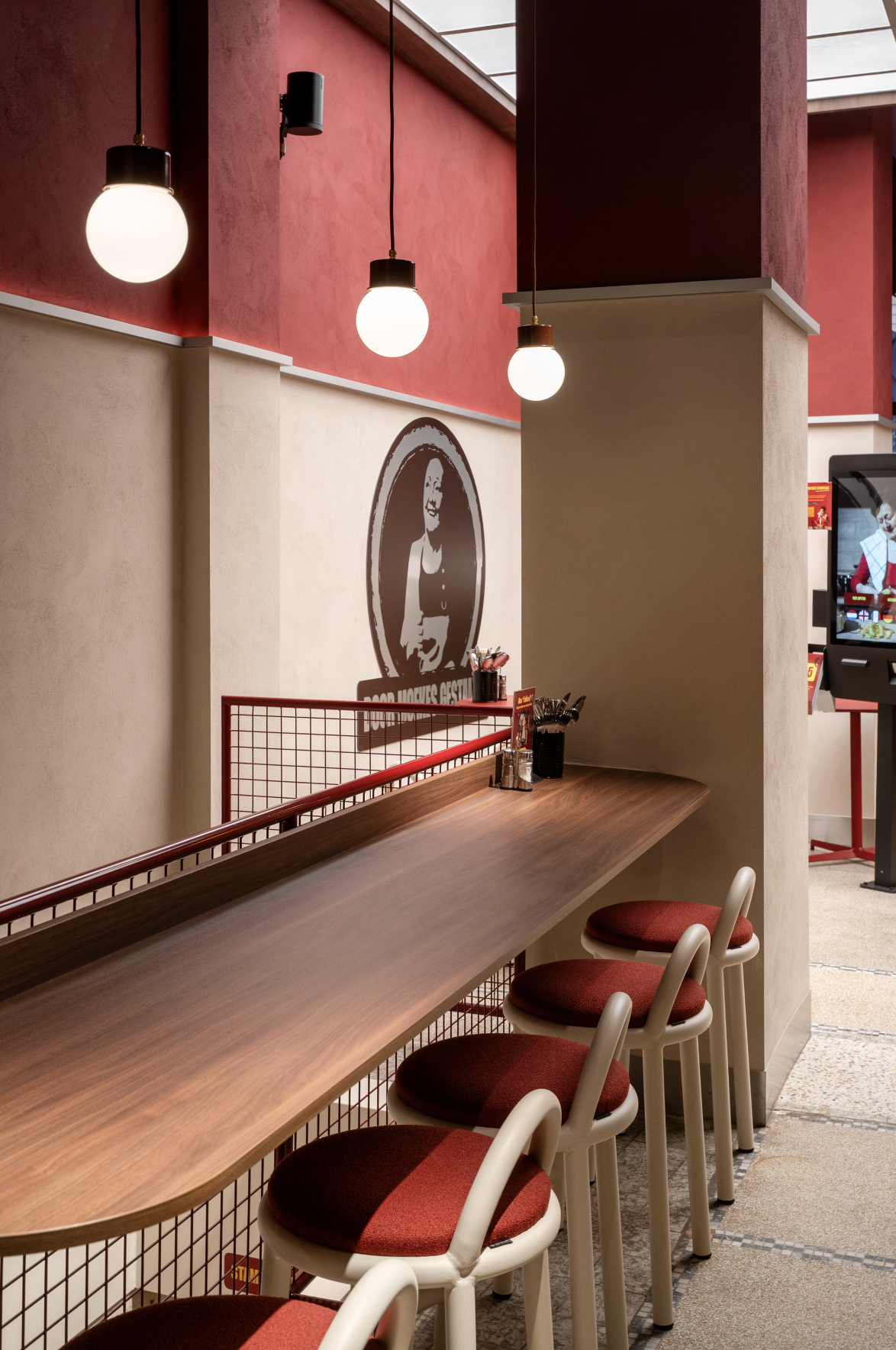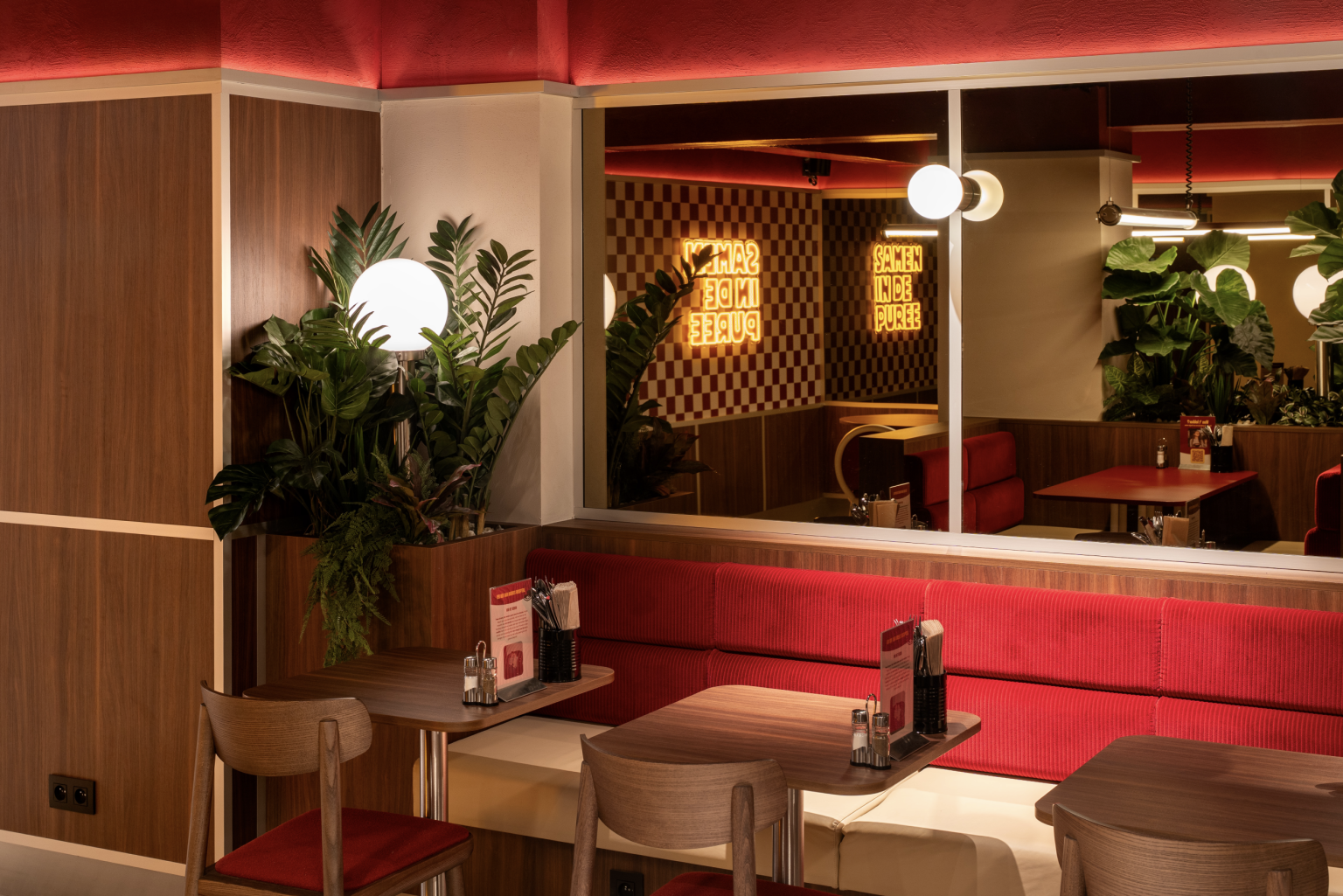 Pureto red (the brand color) was an obvious choice, enhanced by warm materials, comfortable seating, and iconic brand elements that are unmistakably Pureto.