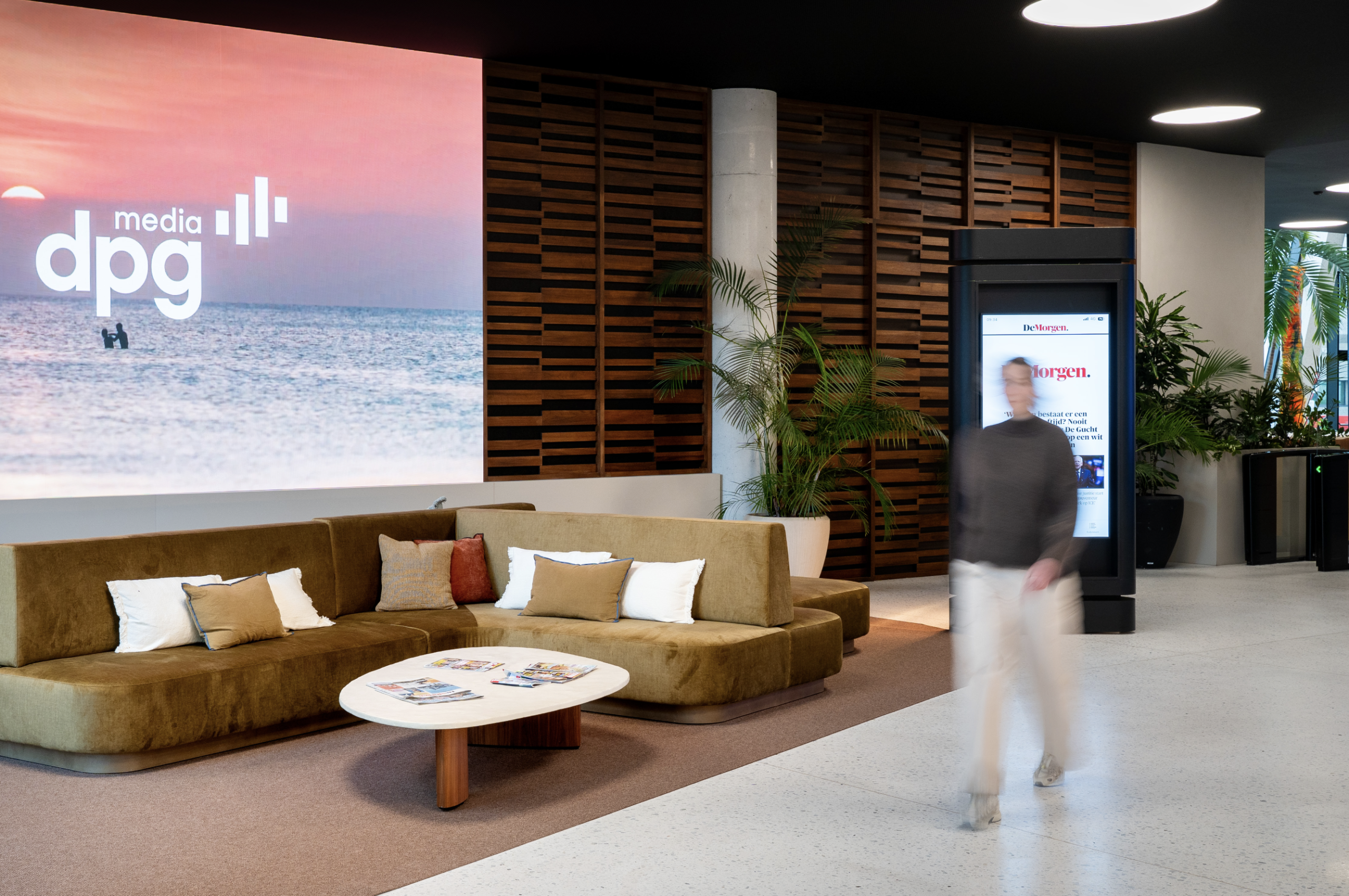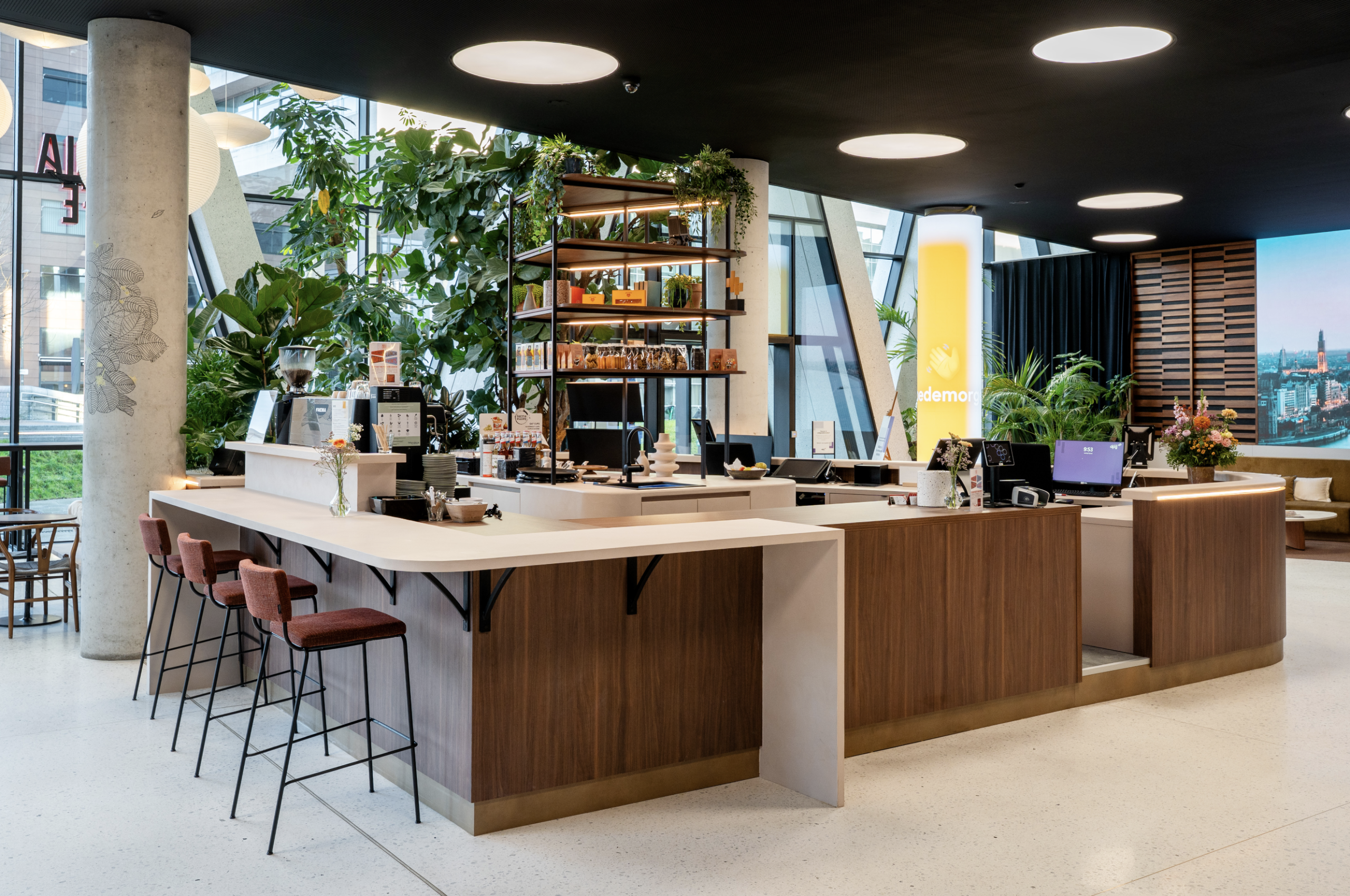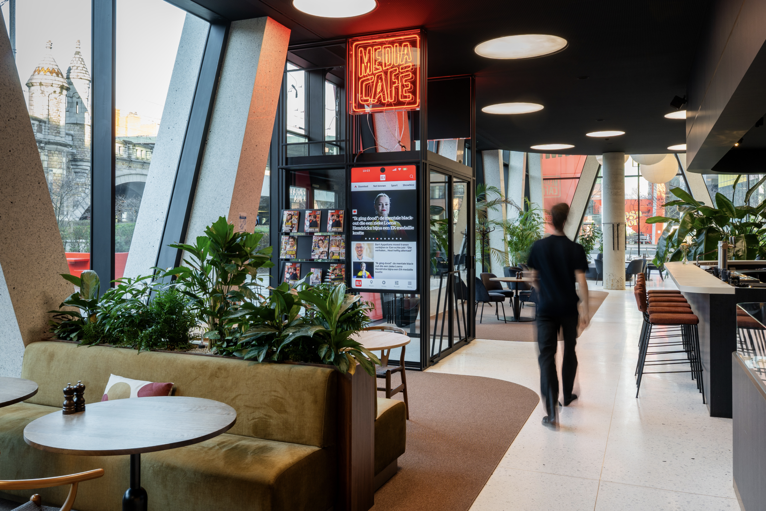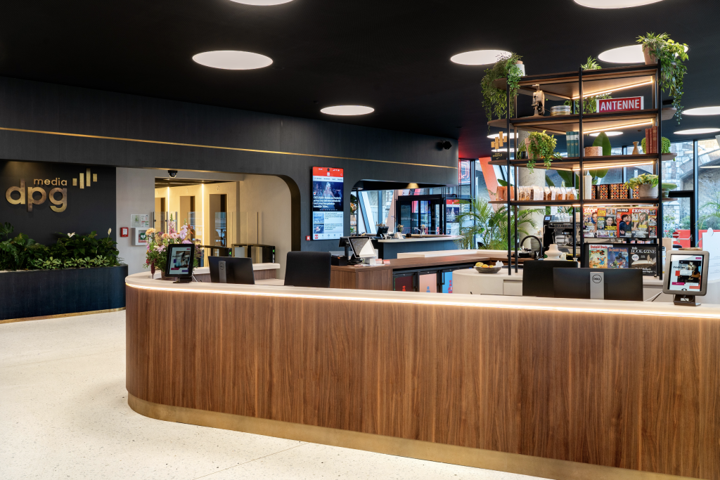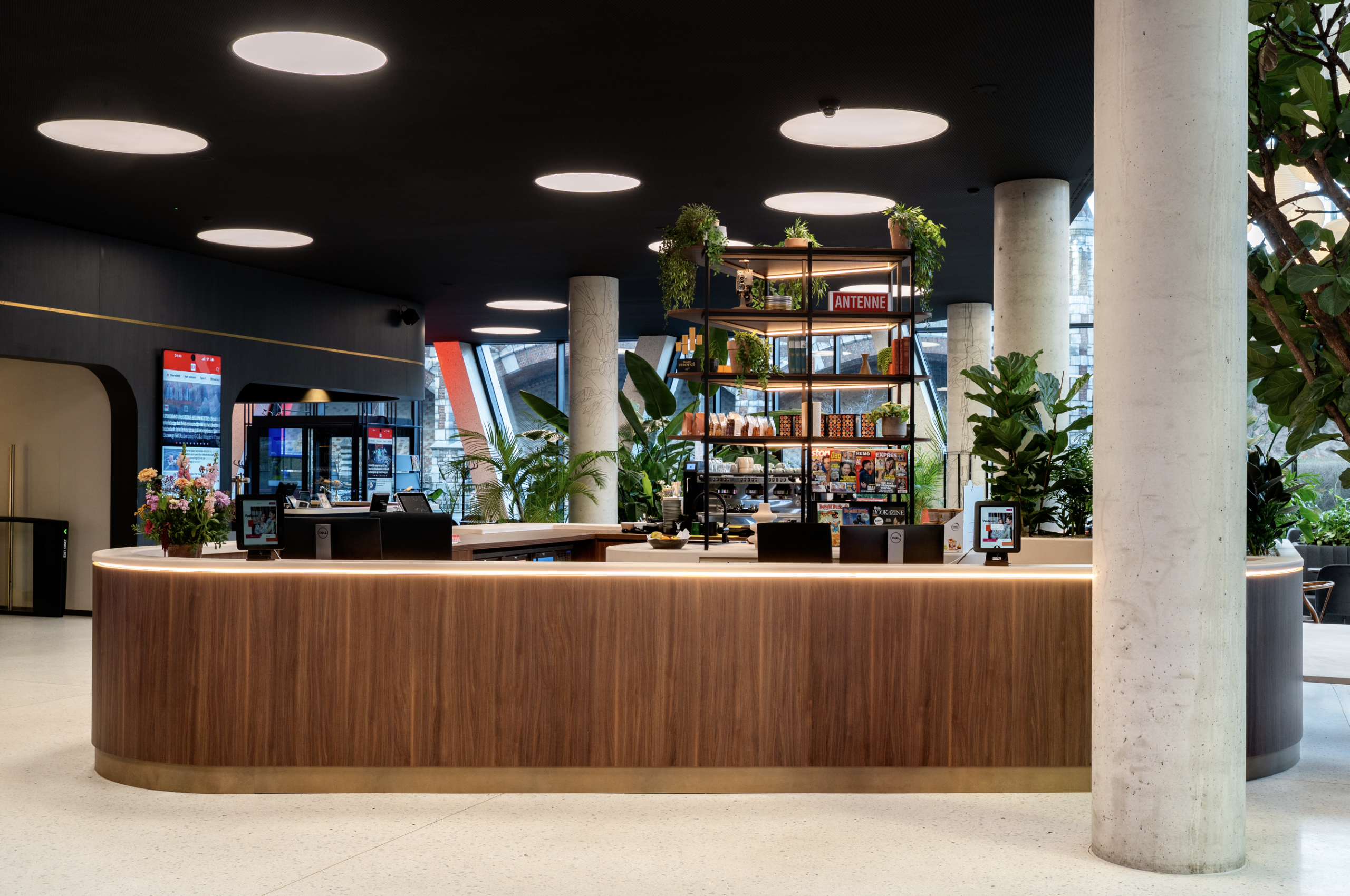 The client brief: "a corporate reception with the atmosphere of a hotel lobby, combined with a public café that breathes media."