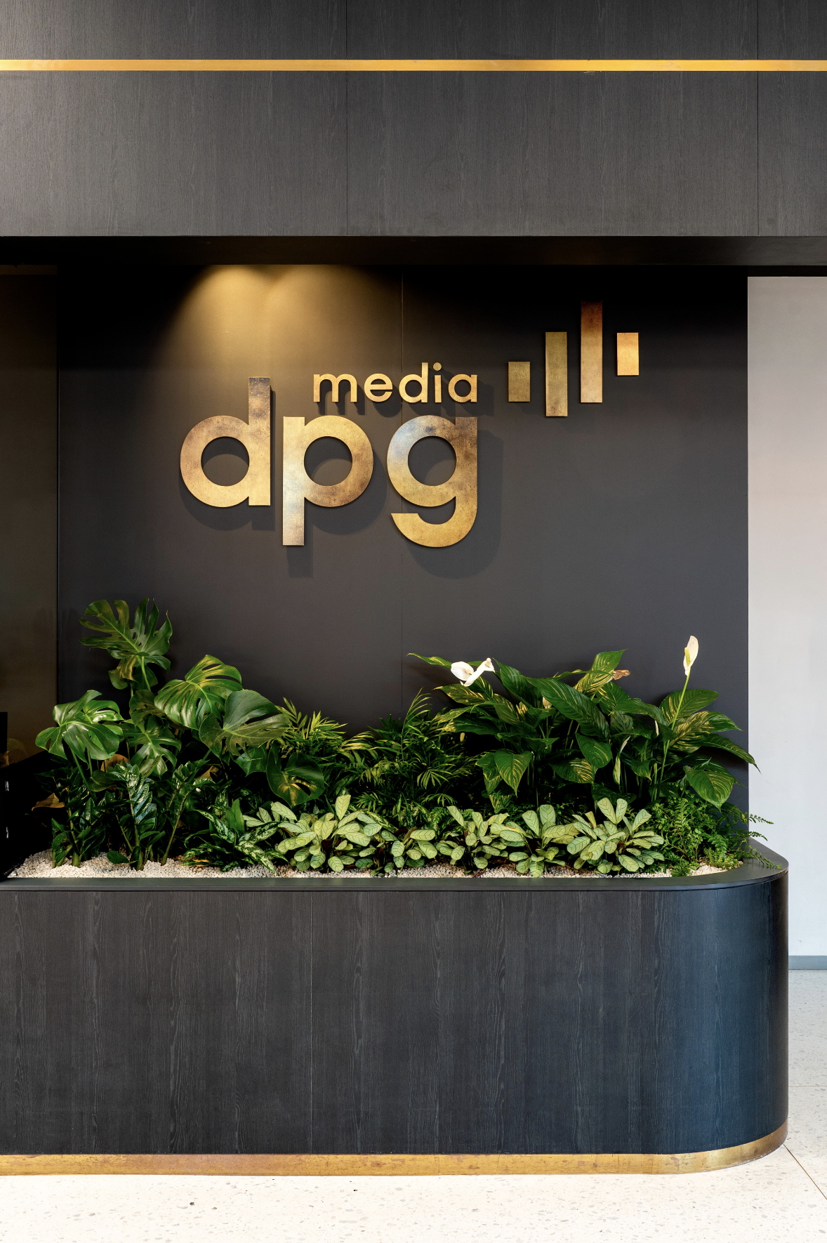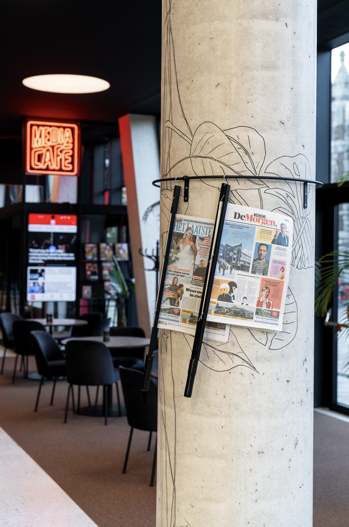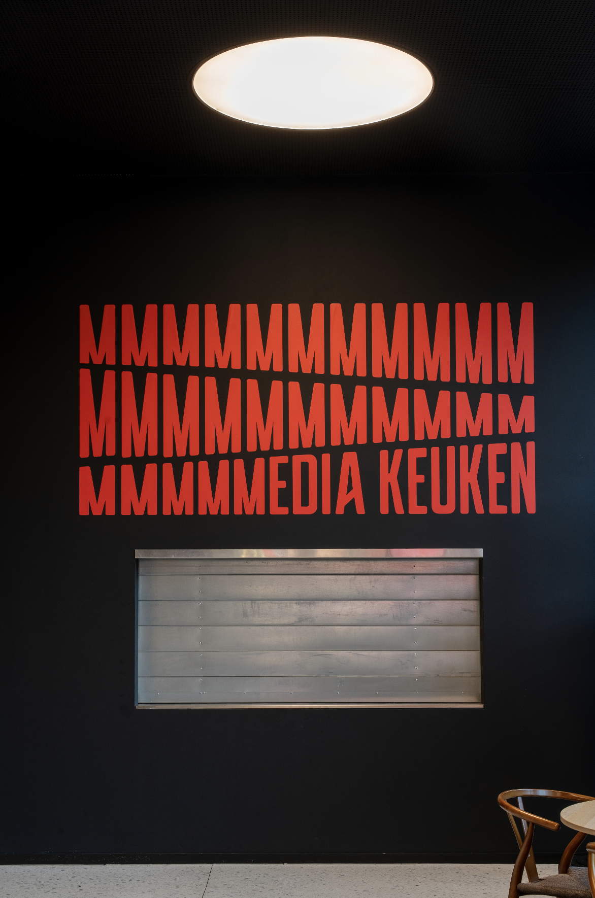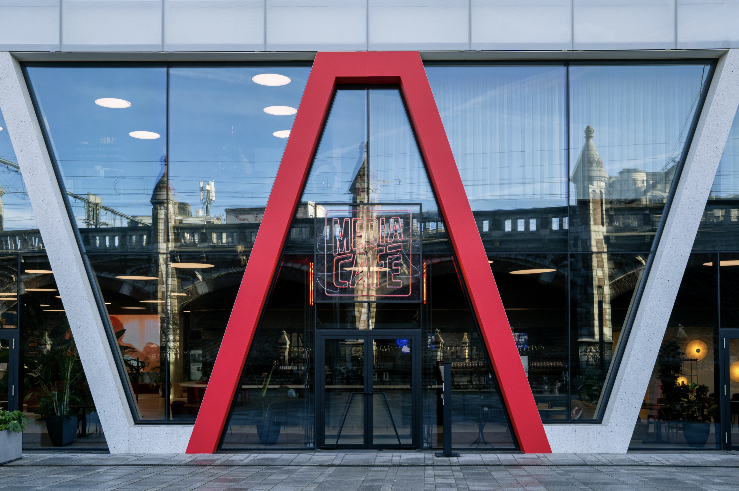 The client brief: "a corporate reception with the atmosphere of a hotel lobby, combined with a public café that breathes media."